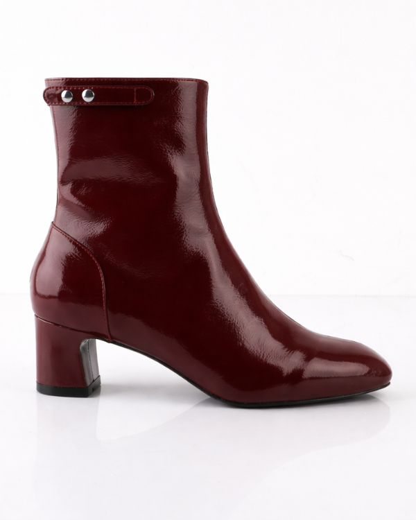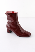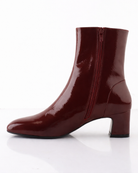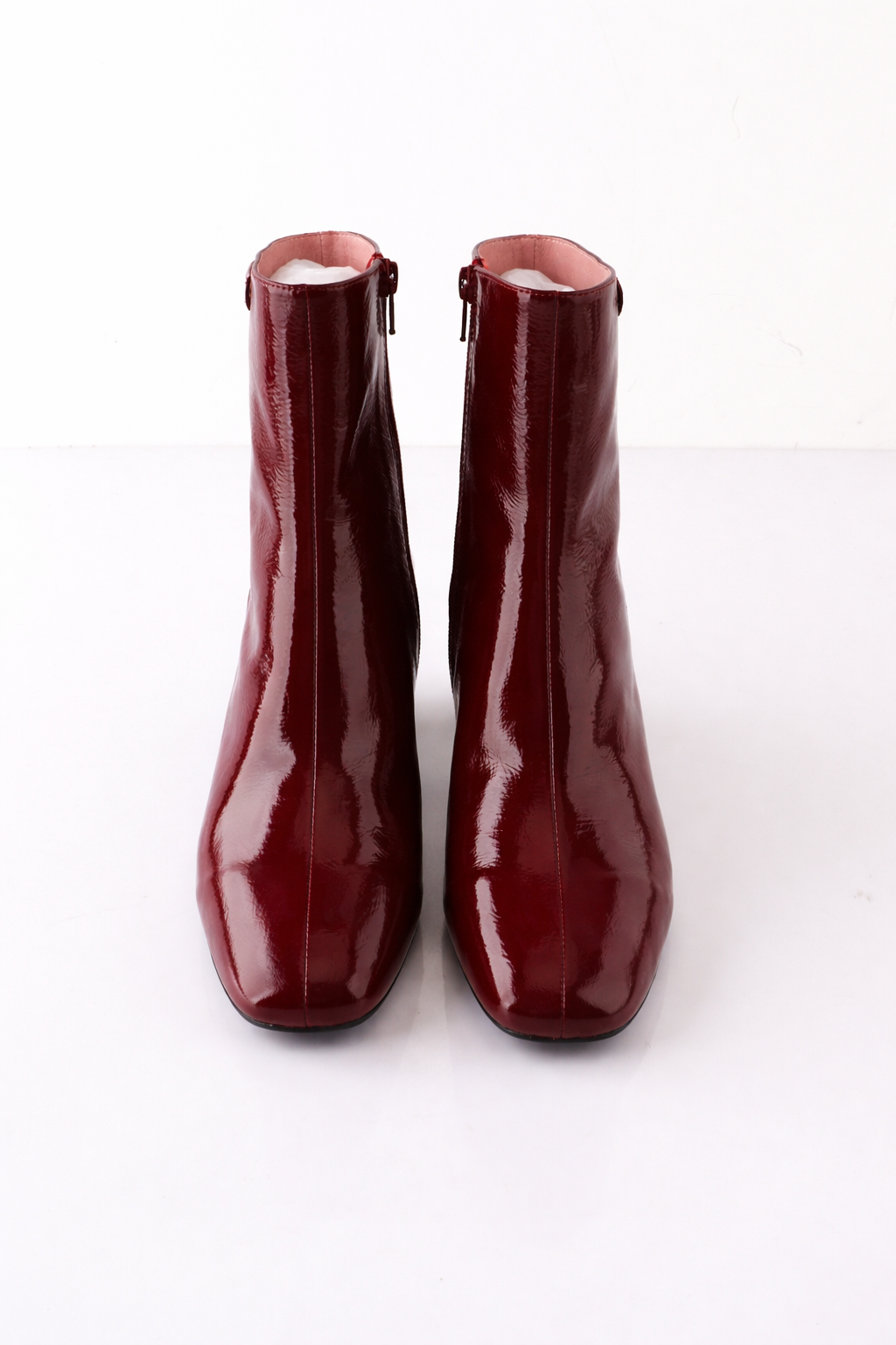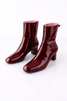 The Wyn Boot in Wine Crinkle features a glossy patent leather exterior with a signature square toe, pale pink kid leather insole and interior, and a side zipper with double exterior snaps for easy wear. Designed for all-day comfort, it includes a memory foam insole that cushions the ball of the foot, arch, and heel. Crafted with imported materials, the boot has a 5 cm / 2-inch heel. Add 31 to your US size (US 8 = EU 39).