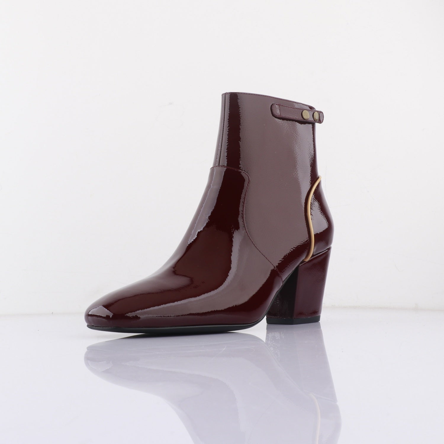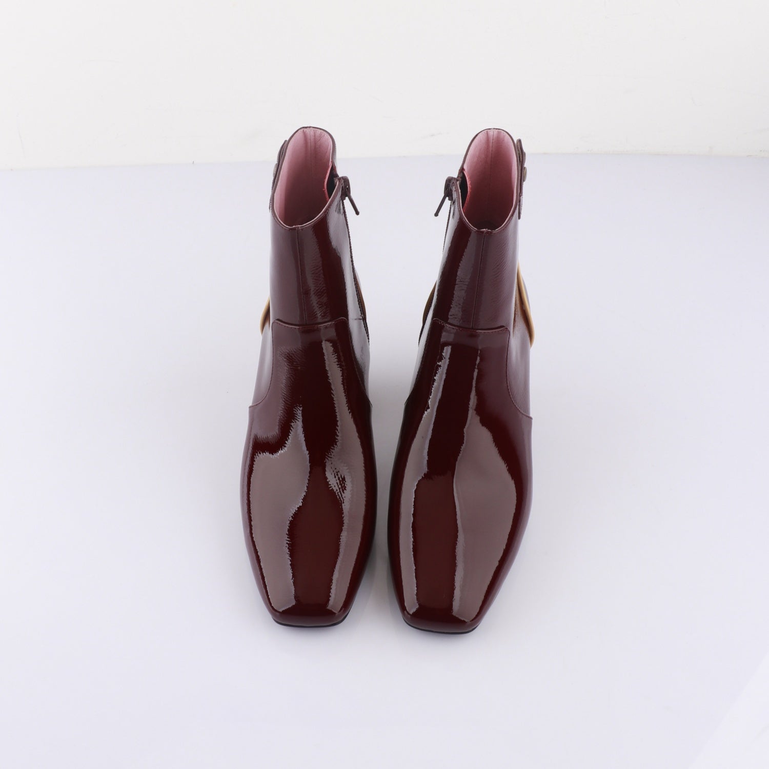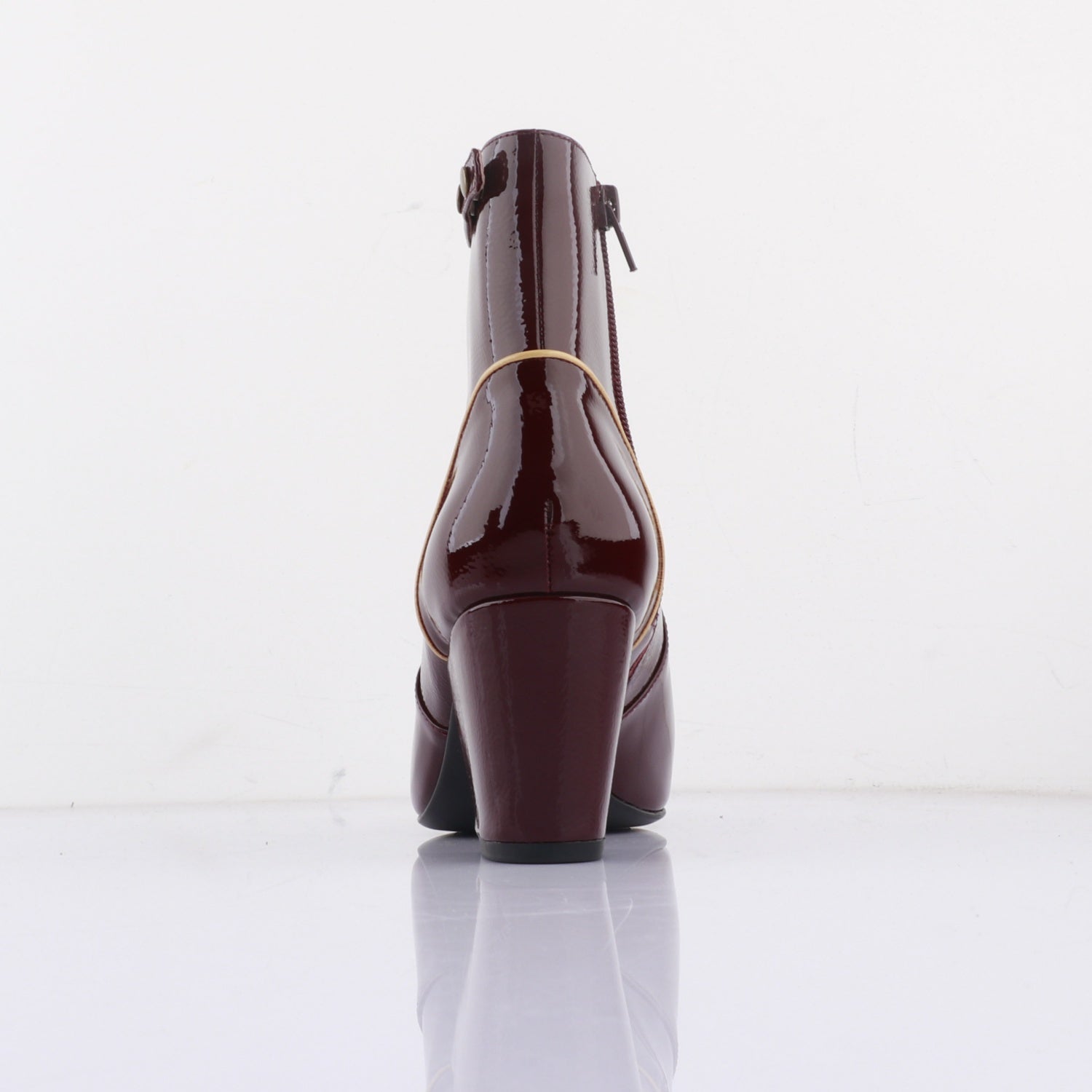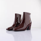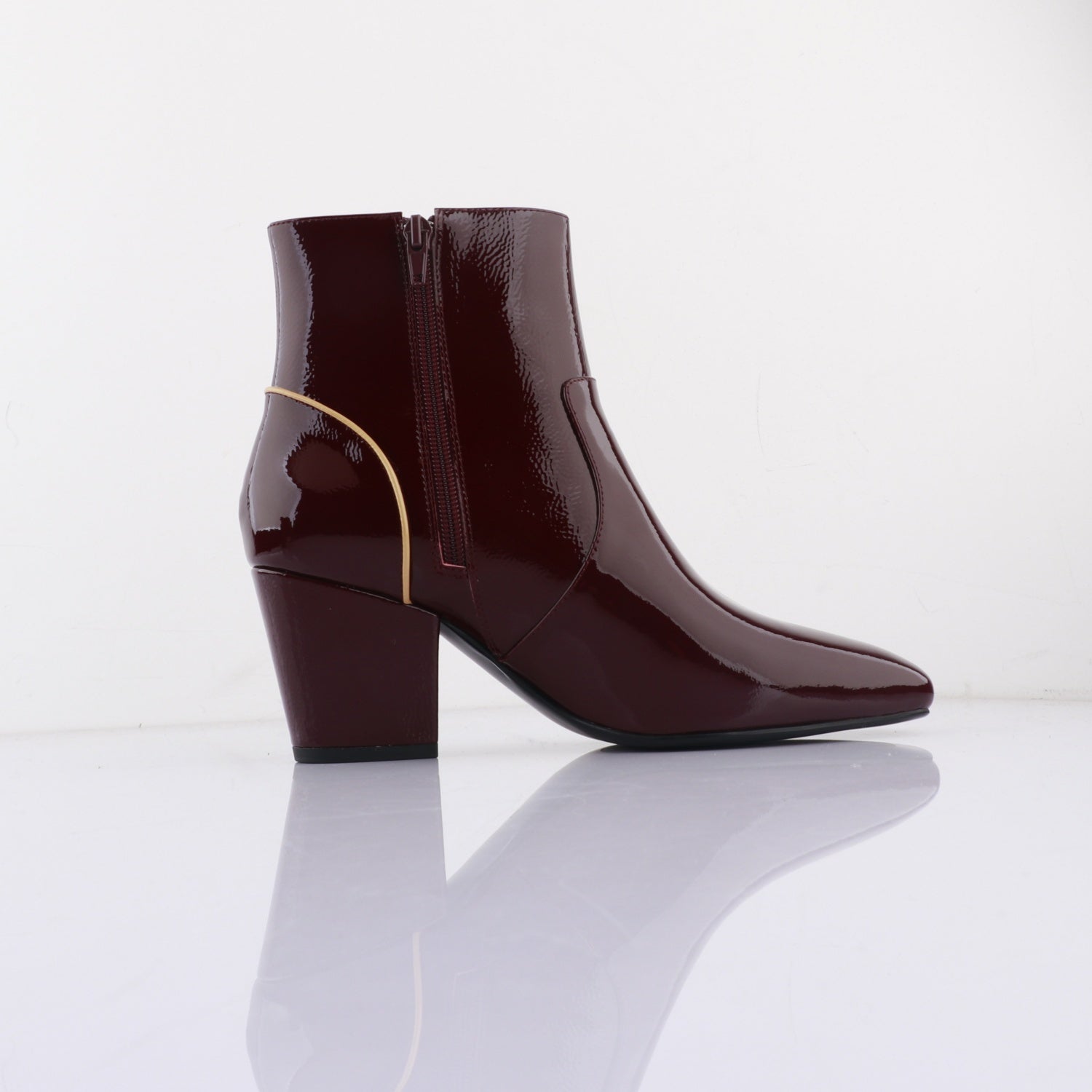 The Cartwright boot in Malbec patent leather, is the Wyn boots sassy and cozy little cousin. With a 6.5 cm heel height and a bit of a more open toe bed. Contrast piping on the heel. Lined in memory foam as always. Step out in style.