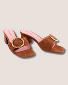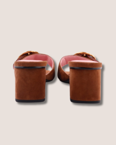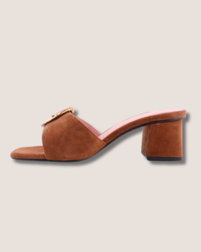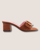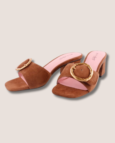Soft suede upper with a gold/brass molded buckle and a stacked offset heel. Memory foam cushion-lined footbed for extra comfort.