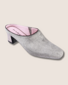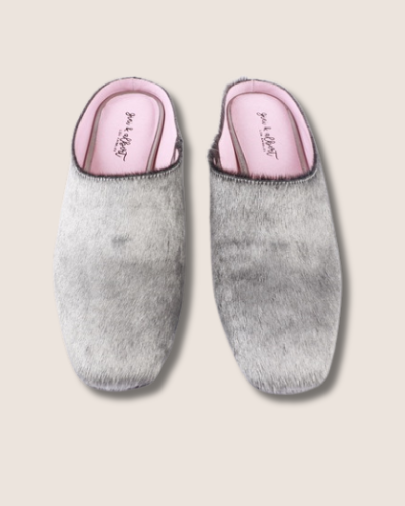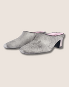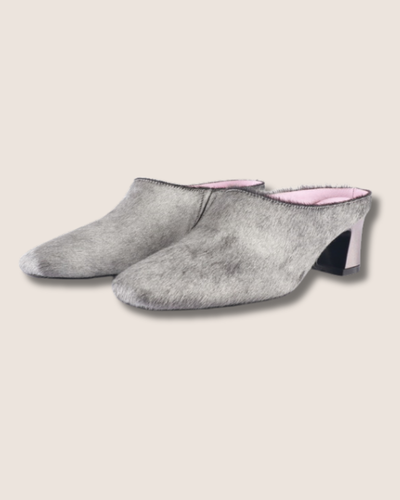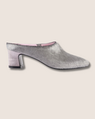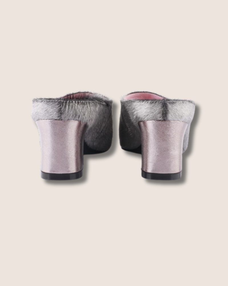 Inspired by the fit of the Wyn boot, the Stella Mule has a Metallic Calf hair upper. It is lined in pale pink leather and has extra doses of memory foam throughout the footbed. The heel is 5 cm. It offers all-day comfort.